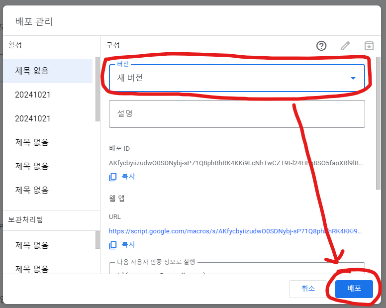 테스트 배포의 경우에는 마지막 exec가 dev이고 URL은 변경되지 않지만 테스트 배포가 아닌 경우에는 아래 배포 메뉴에서 새 배포로 하게 되면 DEPLOYMENT_ID가 계속 바뀌게 된다. 이렇게 되면 변경된 URL로 웹앱을 실행시켜야 하는 번거로움이 발생된다. 따라서, 변경되지 않는 URL로 계속 배포를 하고 싶은 경우 아래의 방법대로 하면 동일한 URL로 배포를 할 수 있다.