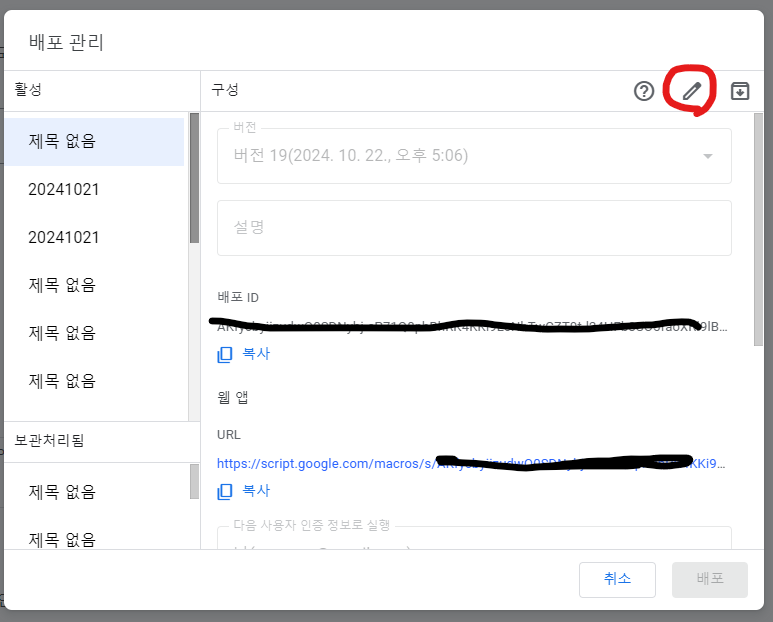 테스트 배포의 경우에는 마지막 exec가 dev이고 URL은 변경되지 않지만 테스트 배포가 아닌 경우에는 아래 배포 메뉴에서 새 배포로 하게 되면 DEPLOYMENT_ID가 계속 바뀌게 된다. 이렇게 되면 변경된 URL로 웹앱을 실행시켜야 하는 번거로움이 발생된다. 따라서, 변경되지 않는 URL로 계속 배포를 하고 싶은 경우 아래의 방법대로 하면 동일한 URL로 배포를 할 수 있다.